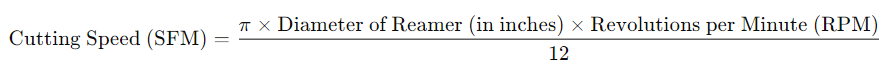 ความเร็วในการตัดหรือความเร็วพื้นผิวหมายถึงความเร็วที่คมตัดของรีมเมอร์เคลื่อนผ่านชิ้นงาน โดยทั่วไปจะวัดเป็นฟุตผิวต่อนาที (SFM) หรือเมตรต่อนาที (m/min) ในการคำนวณความเร็วตัดที่เหมาะสมสำหรับรีมเมอร์ ให้ใช้สูตรต่อไปนี้: