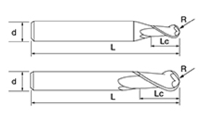 | ชุดเครื่องมือ | เส้นผ่านศูนย์กลาง | รัศมี | รัศมีมุม | ความยาวขลุ่ย | ความยาวที่มีประสิทธิภาพ | ความยาวโดยรวม | ก้าน ดีia | |||