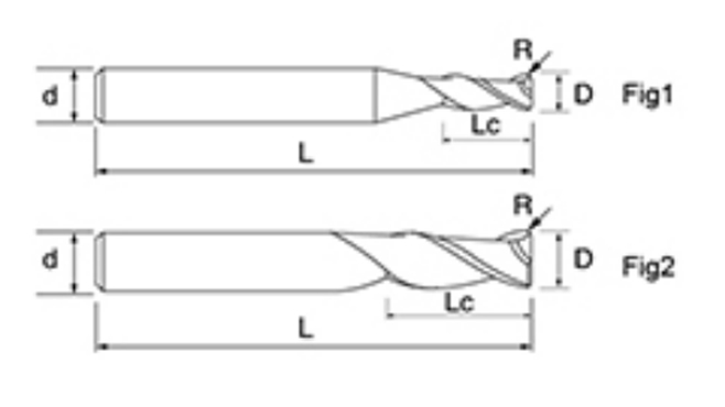 | ชุดเครื่องมือ | เส้นผ่านศูนย์กลาง | รัศมี | รัศมีมุม | ความยาวขลุ่ย | ความยาวที่มีประสิทธิภาพ | ความยาวโดยรวม | ก้าน ดีia | |||