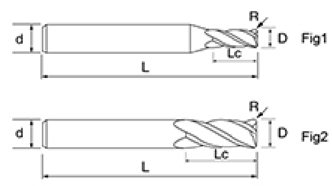 | ชุดเครื่องมือ | เส้นผ่านศูนย์กลาง | รัศมี | รัศมีมุม | ความยาวขลุ่ย | ความยาวที่มีประสิทธิภาพ | ความยาวโดยรวม | ก้าน ดีia | |||